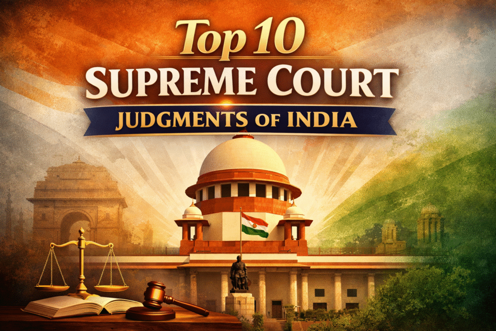 The Supreme Court of India has played a pivotal role in shaping the constitutional, political, and social framework of the country. Through its landmark judgments, the Court has interpreted the Constitution dynamically, protected fundamental rights, and strengthened democratic values. This article discusses the Top 10 landmark Supreme Court judgments of India, which are frequently asked in Judiciary, UPSC, and law entrance examinations and remain foundational to Indian constitutional law.